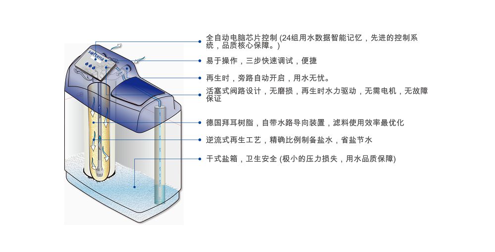 e、濾料品質(zhì)頂級(jí)、軟化效果的保障,國(guó)際先進(jìn)的濾料選擇,樹脂采用德國(guó)拜耳樹脂,軟水品質(zhì)的保證。